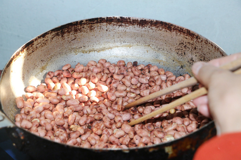 Bà Châu kể lại công thức chẻo được bà truyền lại, bà cho biết lạc là nguyên liệu chính để chế biến món chẻo, Lạc được rang vừa tay, không giòn “già” nhưng cũng không quá “non” để đảm bảo màu sắc và mùi vị. Quá trình chọn lựa Lạc cũng rất công phu, tỉ mỹ.