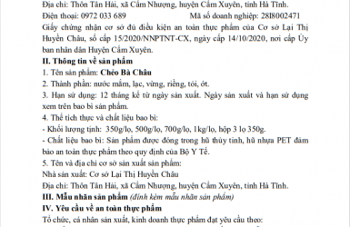 Bản tự công bố chất lượng sản phẩm Chẻo Bà Châu : Số 01/ HKD Lại Thị Huyền Châu/ 2021